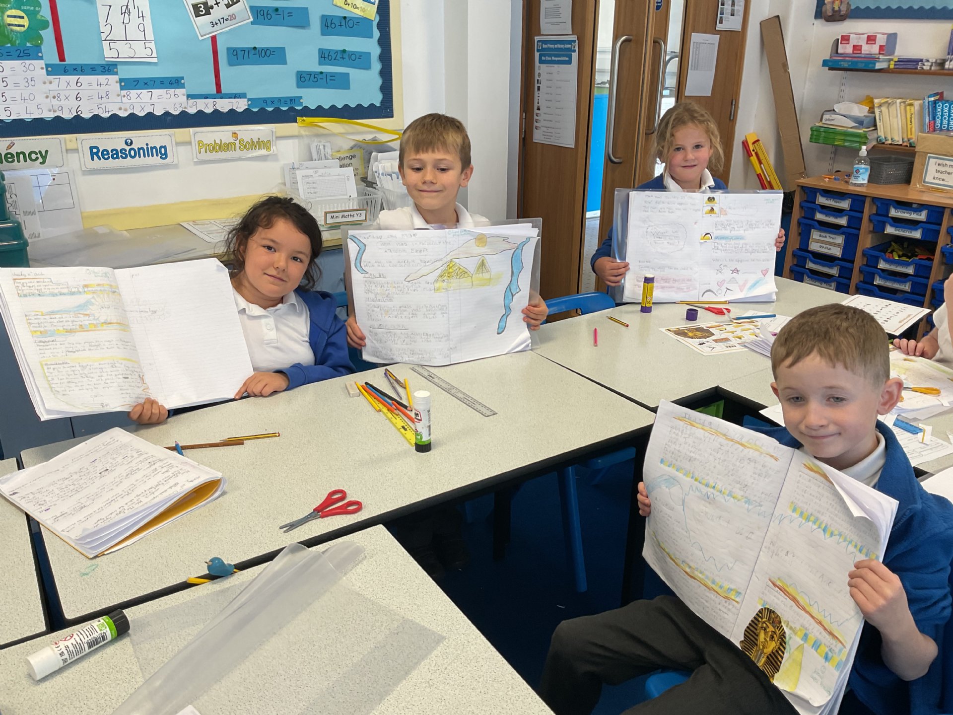 In History, the class has been busy creating double-page knowledge spreads to answer the question: "How important was Ancient Egypt?" The children explored fascinating themes including the River Nile and how it supported daily life, the afterlife and mummification, hieroglyphics, and a range of artefacts and inventions that tell us so much about this remarkable civilisation. Their work beautifully showcased both their historical understanding and creativity.